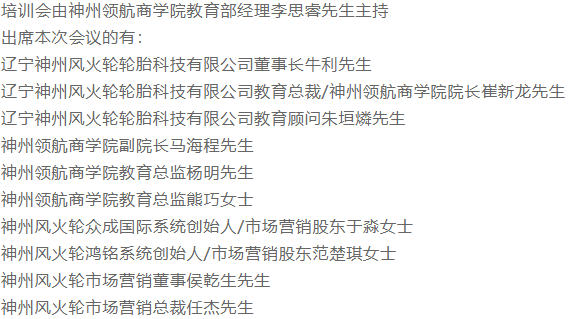 本次代理商培訓(xùn)會的明星導(dǎo)師10余位,將陪伴大家共同度過這三天兩夜。本次培訓(xùn)會旨在為新晉代理商伙伴闡述神州風(fēng)火輪企業(yè)文化、樹立整體市場觀念、規(guī)范營銷制度、拓展營銷思路。